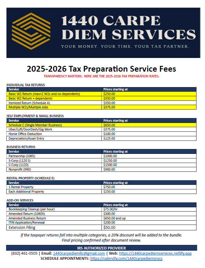Carpe Diem is Latin for “Seize the Day” — and there are 1,440 minutes in one day. At 1440 Carpe Diem Services, we don’t just prepare taxes — we maximize moments, protect compliance, and use every minute wisely to deliver clarity, trust, and impact. A service built on intentionality, respect for time, and a commitment to making every day count.